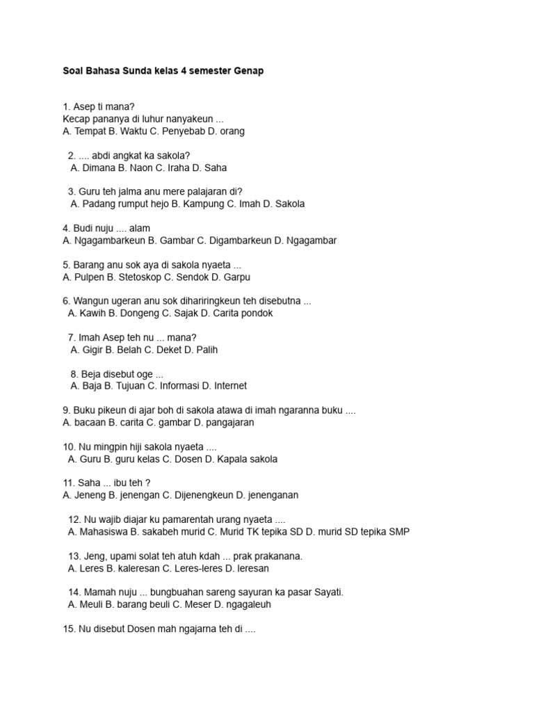 - Kecap "asri" dina kalimah panungtung hartina sarua jeung… (pilihan ganda: ramé, éndah, kotor, réa jalma).
